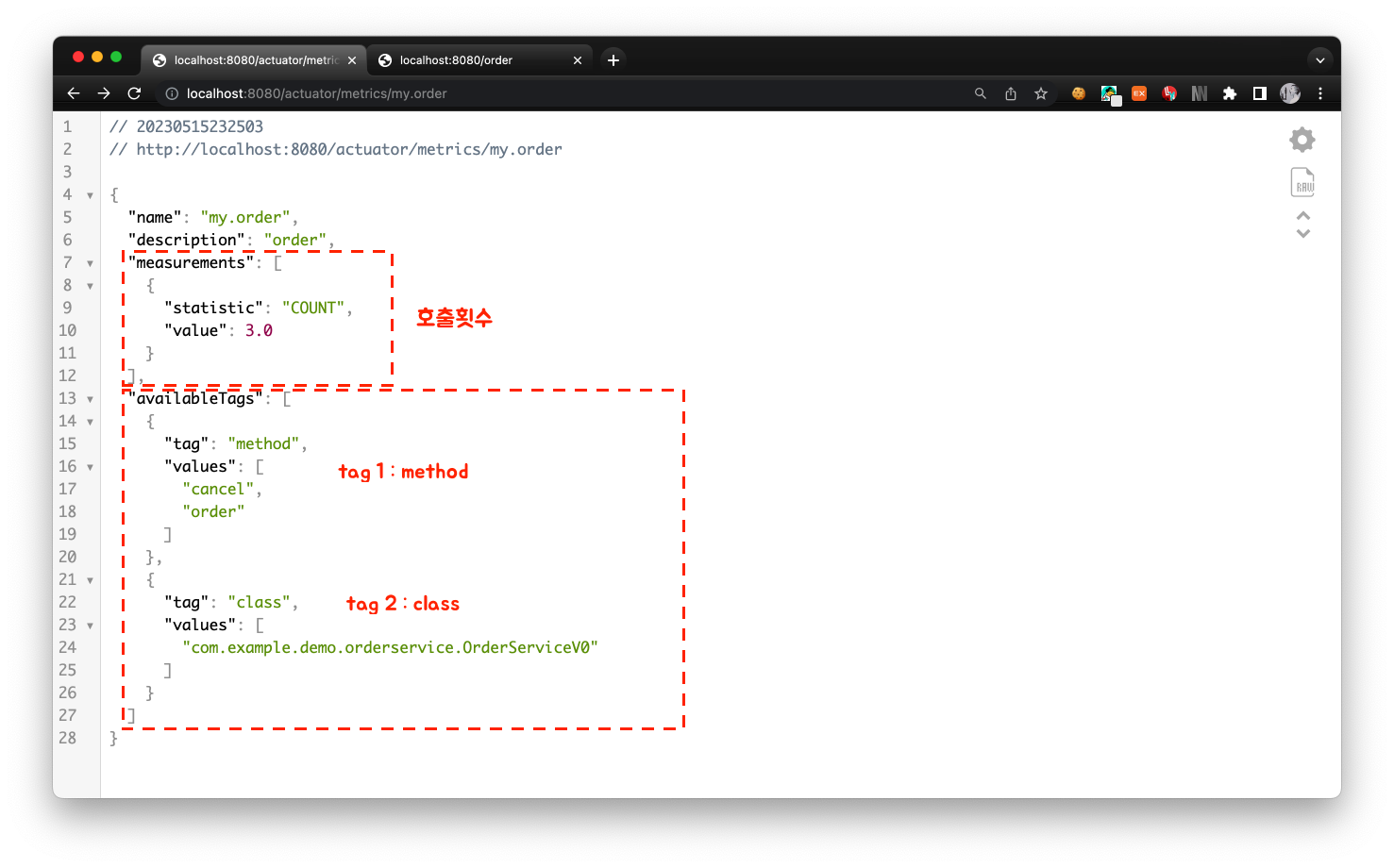 JSON 방식으로 메트릭이 생성되었음을 확인할 수 있다. 나는 주문과 취소를 총 3회 수행해서 호출횟수의 VALUE가 3이다. availableTags 는 해당 메트릭에 등록된 태그를 보여준다. 우리는 method 태그와 class 태그를 추가해서 위와 같다.