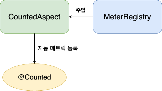 이전 코드는 개발자가 직접 MeterRegistry를 조작했다. 이번에는 MeterRegistry를 주입받은 CountedAspect에게 메트릭 생성을 일임할 것이다. CountedAspect 객체가 Bean으로 등록하면 @Counted 어노테이션이 달린 메소드들을 읽고 메트릭으로 자동등록한다. 이렇게 되면 개발자가 굳이 메트릭 등록 코드를 짤 필요가 사라진다.