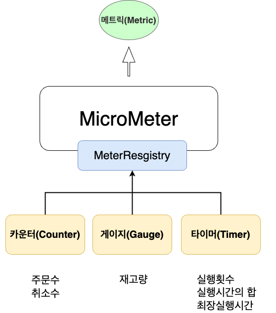 MeterResistry는 데이터를 메트릭으로 등록하는 마이크로미터 모듈이다. MeterResistry는 스프링이 자동으로 IOC컨테이너에 Bean으로 등록하므로 의존관계 주입만 하면 사용할 수 있다.