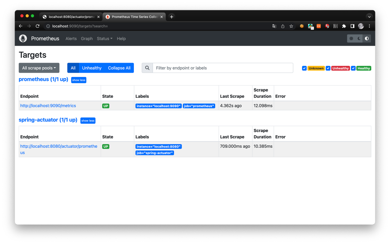 프로메테우스 서버를 실행하고 SpringBoot 프로젝트와 연동하였다.