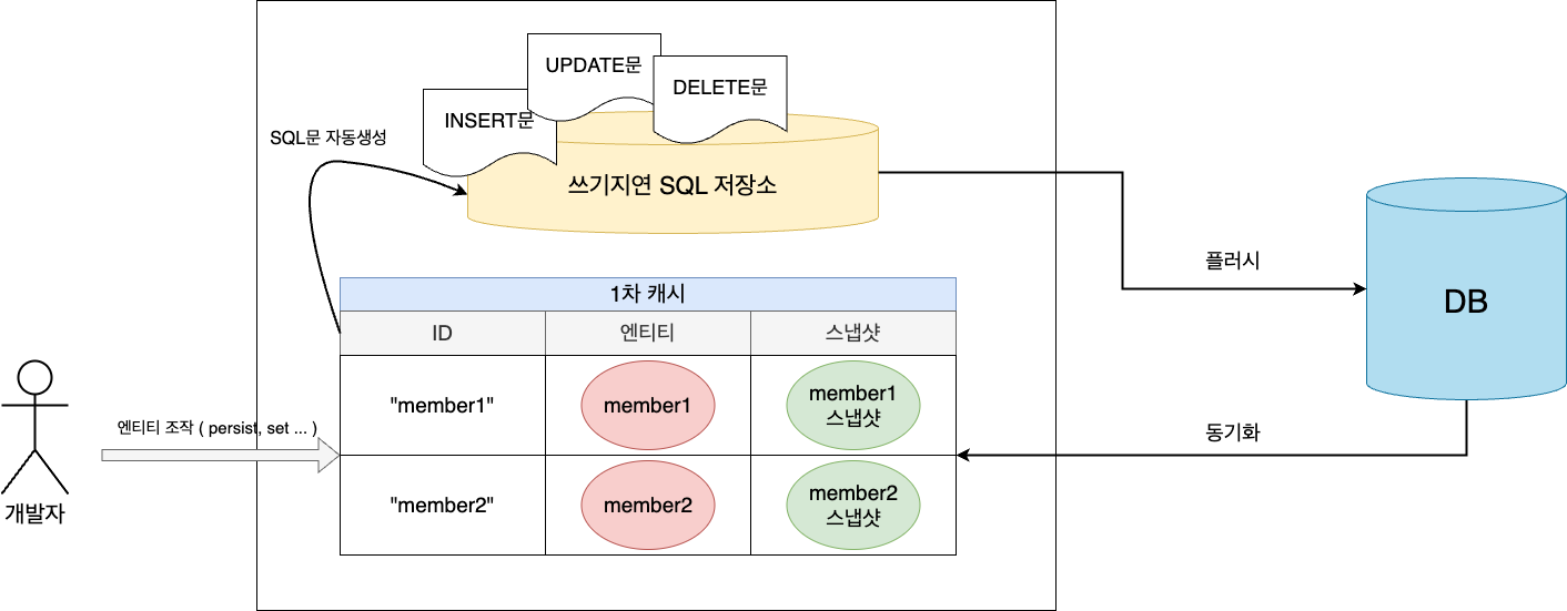 1차 캐시 영역에 DB에서 데이터를 가져온 최초 상태를 '스냅샷'으로 관리한다. 만약 개발자가 영속화된 인스턴스, 즉 엔티티(Entity)의 필드데이터를 변경(setter)하면, 스냅샷과 비교하여 변경된 부분을 동기화 할 수 있는 UPDATE문을 자동생성하여 쓰기지연 SQL 저장소에 저장한다.
