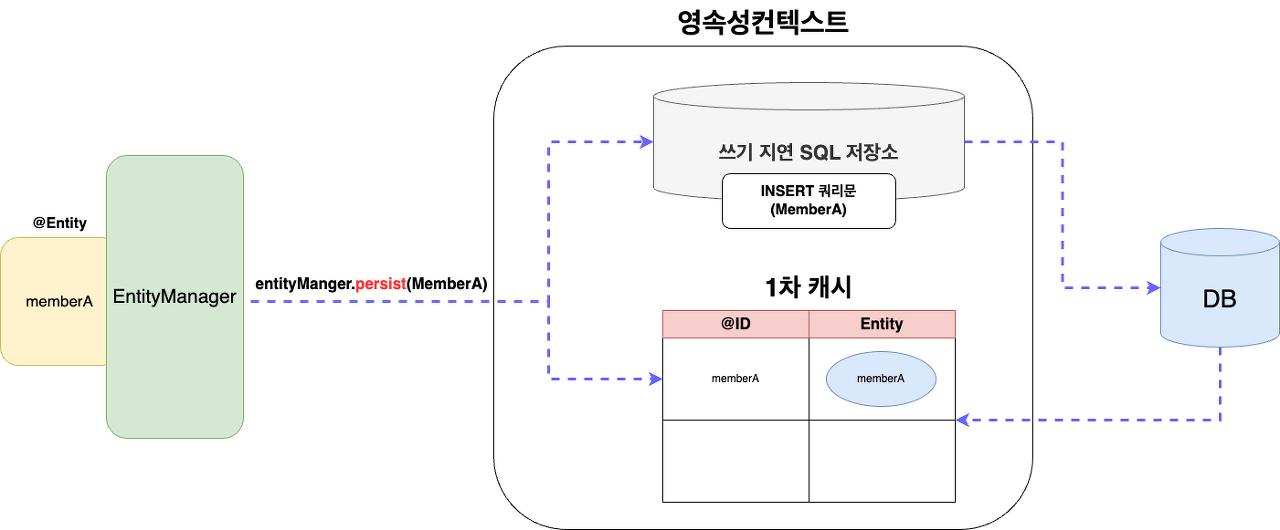 4개의 쿼리는 영속성 컨텍스트에 존재하는 쓰기지연SQL저장소에 저장된다. SQL문이 생성은 되지만 수행되지는 않는다. ( execute X ) 만약 SQL문을 실행시키고 싶으면 entityManager.flush()를 하면 된다. 플러쉬(flush)는 쓰기지연SQL저장소에 저장되어 있는 SQL문을 실행하는 역할을 한다. 그럼 영속성컨텍스트와 DB가 '동기화'된다.