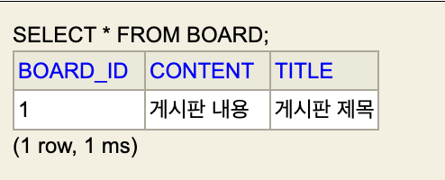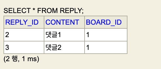 댓글 테이블에 UPDATE문이 실행되었음을 알 수 있다. 외래키는 댓글테이블에 있어야 하지만 일대다 관계라 댓글 엔티티에는 외래키설정이 없다. 그래서 JPA가 Board 클래스의 @OneToMany 어노테이션을 읽고 연관되어 있는 댓글 테이블에 UPDATE문을 실행하여 외래키를 생성해 준 것이다.