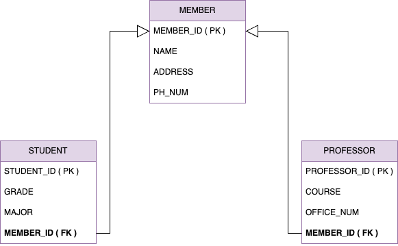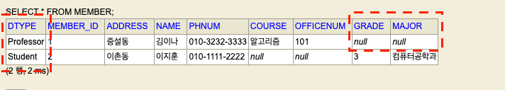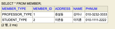 MEMBER 테이블에 구분컬럼이 추가되었고 자식 엔티티에서 설정한 구분타입명이 컬럼값으로 들어가 있다. 구분타입명이 있으면 시스템 통합에 유용해진다. 다른 시스템은 PROCESSOR테이블과 STUDENT테이블에 각각 접근하지 않아도 된다. MEMBER테이블에 접근하면 구분컬럼으로 원하는 테이블에 필요에 따라 접근할 수 있다.