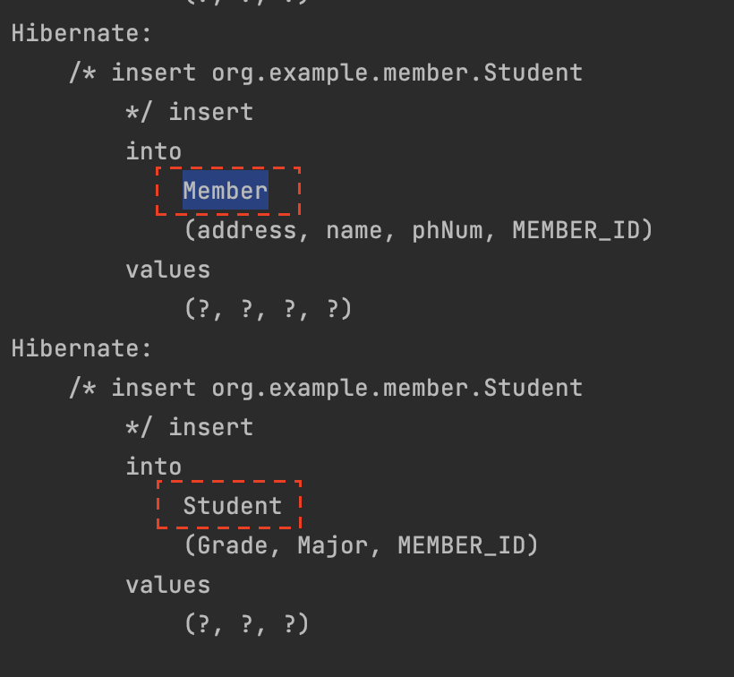 Student 엔티티와 Professor 엔티티를 생성하고 영속화하였다. Member 엔티티를 생성하지 않았지만 자동으로 테이블이 구성된다. 그리고 INSERT문이 수행된다. 자식 엔티티 하나 생성하고 영속화하면 INSERT문은 2개가 생성된다.