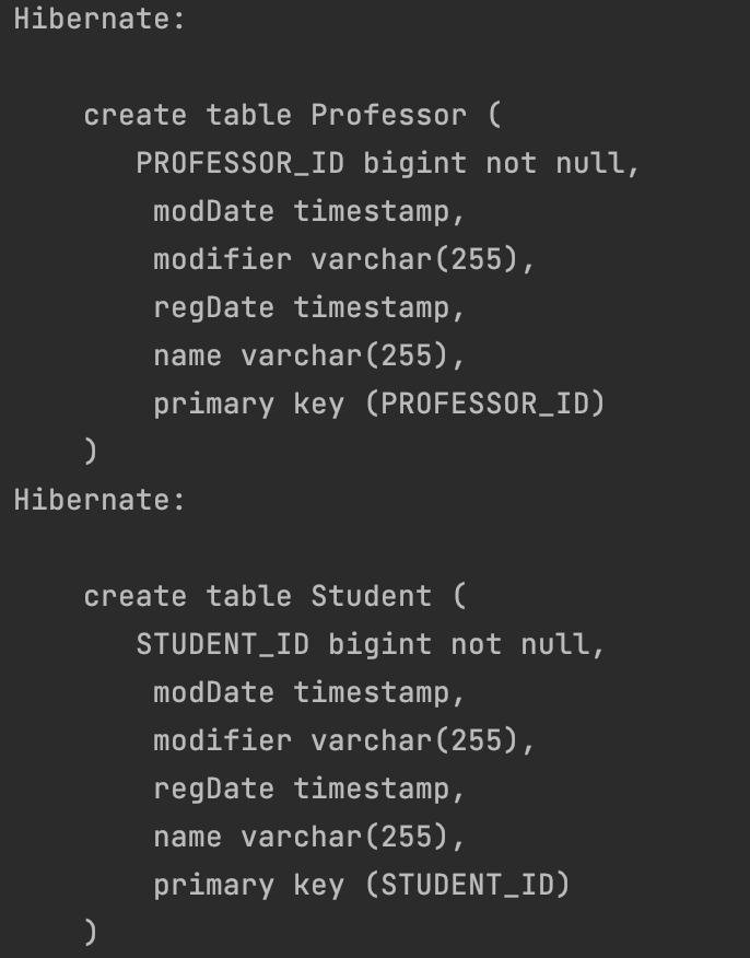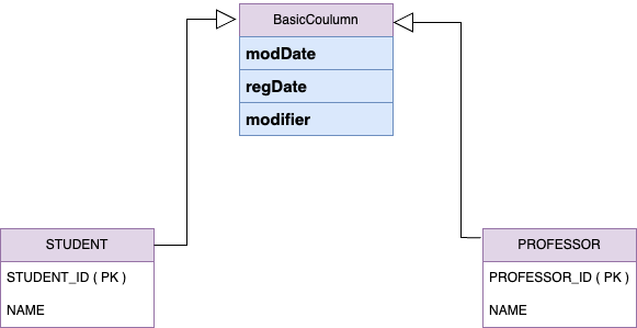 공통추상클래스는 테이블로 생성되지 않고 그저 컬럼매핑정보만 자식클래스에게 넘겨주었다. 자식클래스는 넘겨받은 매핑정보대로 공통컬럼을 생성할 수 있게 된다.