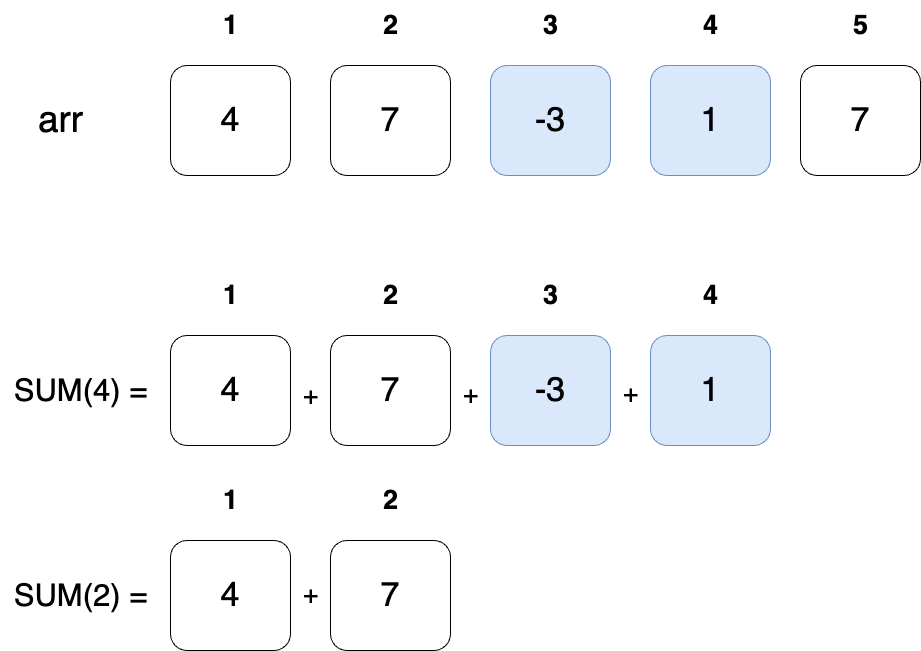 반복문을 활용하면 시간제한에 걸린다. 그러니 prefix-sum 알고리즘을 활용해보자. prefix-sum(누적합) 알고리즘은 초기화 할때, O(N) 시간복잡도로 수행되고 합을 구할때는 O(1) 시간복잡도로 구현된다. prefix-sum 알고리즘은 미리 누적합을 자료구조에 넣어두어 부분합을 구할 때 시간복잡도를 줄이는 원리이다.