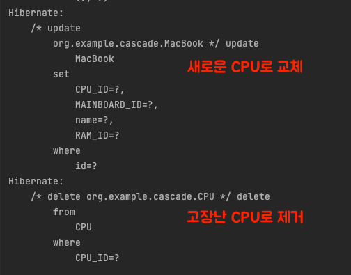 변경감지(DirtyChecking)로 UPDATE문이 실행되어 새로운 CPU로 변경되었지만 고장난 CPU는 DELETE 되지 않았다.