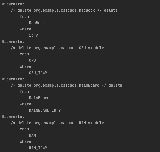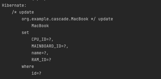MacBook 엔티티 생성자를 보면 CPU, RAM, MainBoard는 MacBook 객체가 생성될 때 동시에 생성된다. 다시 말해서, MacBook과 생명주기를 같이한다. 그러므로 영속성도 같이해야 한다. 영속성 전이를 위해 연관관계 매핑에서 cascade 설정을 추가하였다. MackBook이 영속화 되면 자동으로 CPU,RAM,MainBoard도 영속화 된다.