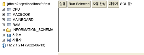 그랬더니 영속화 하지 않았던, CPU,RAM,MainBoard도 동시에 INSERT 되어지는 것을 확인할 수 있다. 영속성전이로 이들도 모두 영속화 되어 관리되고 있던 것이다. H2콘솔을 확인하면 연관된 엔티티들이 모두 테이블이 생성되어 있다.