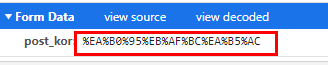 브라우저의 문자셋(charset)은 UTF-8로 세팅되었다. 그리고 F12를 눌러 한글이 어떻게 인코딩 되는지 확인해 보았다.