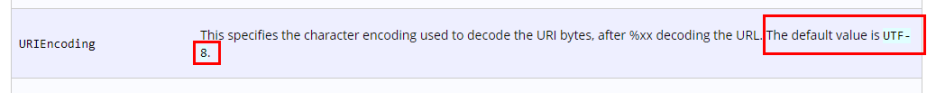 아파치 API 문서에 따르면, URIEncoding은 URI를 처리하는 인코딩 방식을 설정하는 속성이다. 디폴트 값이 UTF-8이다.