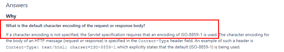 아파치 톰캣 관련 문서를 살펴보면, HTTP body의 디폴트 인코딩 방식은 ISO-8859-1이라고 적혀있다. ISO-8859-1은 서유럽권 문자를 나타내는데 사용하는 인코딩 방식이다.