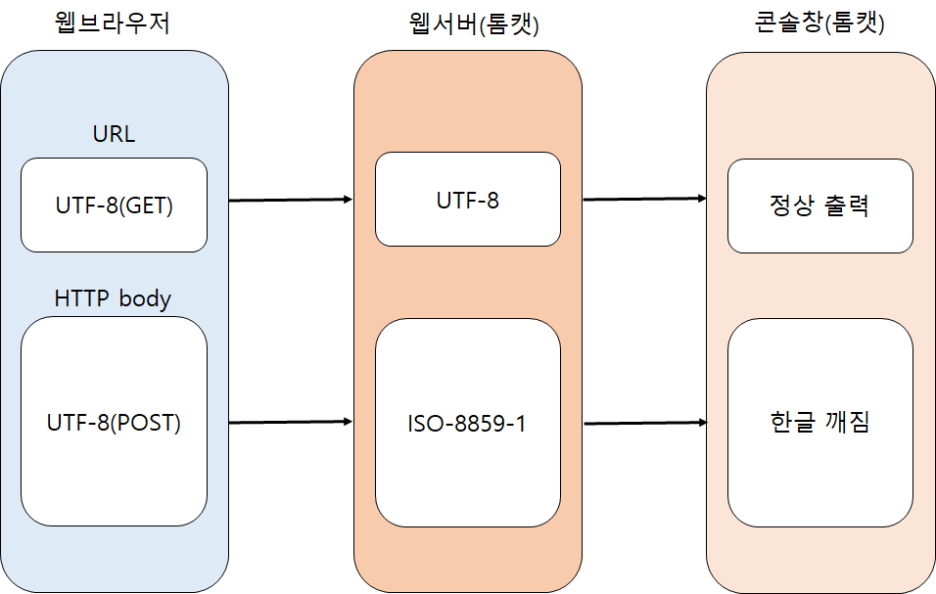 웹브라우저는 2Byte씩 처리하는 UTF-8 인코딩 방식을 사용하는데, 웹서버는 1Byte씩 처리하는 ISO-8859-1 방식으로 인코딩을 하면, 서로 다른 인코딩 방식 때문에 적절한 디코딩이 이루어지지 않는 것이다.