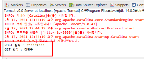 위와 같이, 한글을 POST 방식과 GET 방식으로 서버에 전송하여, 서버 콘솔을 통해, 서버에 어떻게 값이 전달되었는지 확인해 보았다.