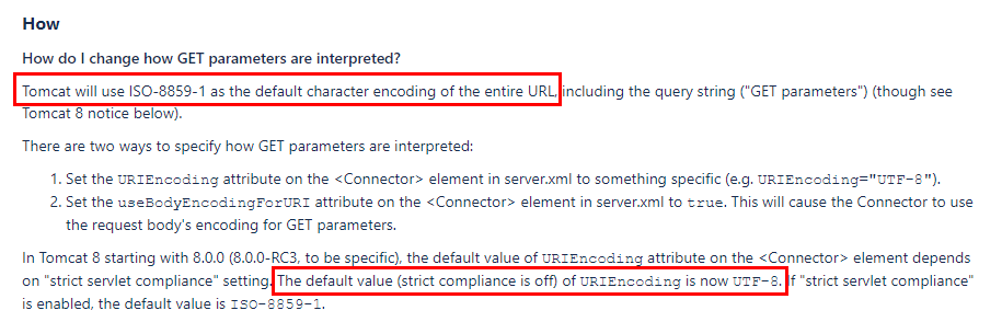 아파치 톰캣 관련 문서에 따르면, 톰캣은 URL 인코딩 방식을 앞으로 ISO-8859-1 방식으로 할 예정이지만, 현재 톰캣 8버전의 URIEncoding 속성의 디폴트는 UTF-8로 설정되어 있다고 말한다. 나는 현재 톰캣 9 버전을 사용하고 있는데, 아직 URIEncoding이 디폴트로 UTF-8로 유지되고 있는 것 같다.