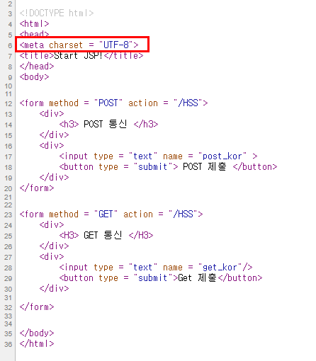 POST 방식은 한글이 깨졌지만 GET 방식은 한글이 깨지지 않았다. GET과 POST가 다른 결과가 나오는 이유는 무엇일까? 우선 나는 meta 태그를 통해 브라우저가 UTF-8 방식으로 한글을 인코딩하도록 설정하였다.