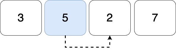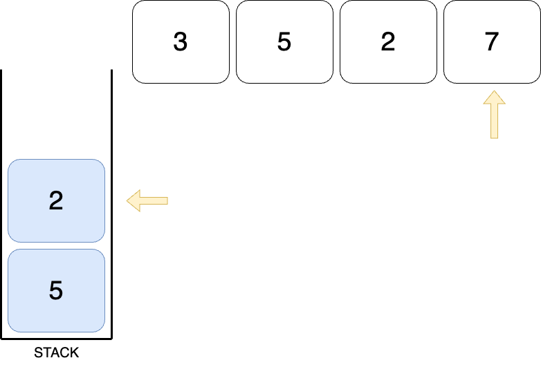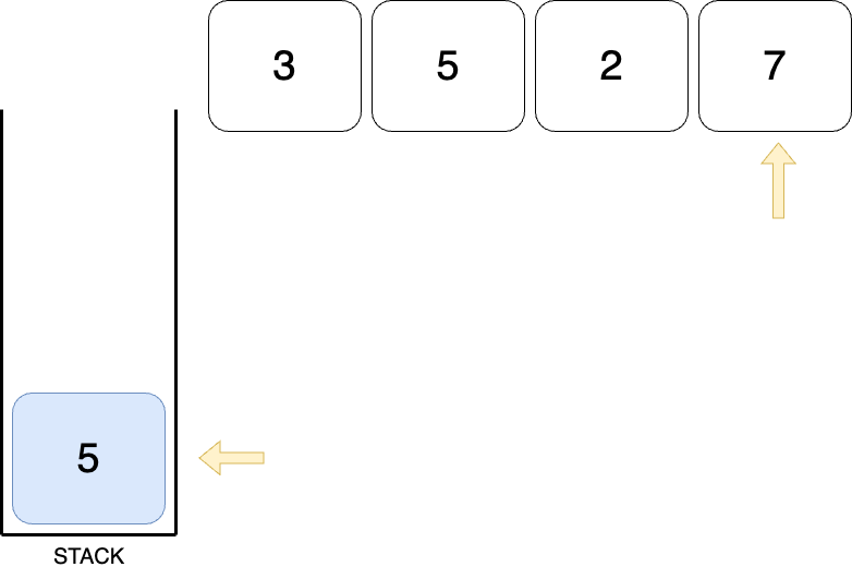 STACK의 top은 바로 POP 될수 있는 수이다. 5는 잠시 2 밑에 KEEP해두고 2와 2의 오른쪽 수인 7를 비교한다. 7은 2보다 크므로 2의 오큰수는 7이 된다. 그럼 KEEP 해둔 5를 꺼낼 차례이다.
