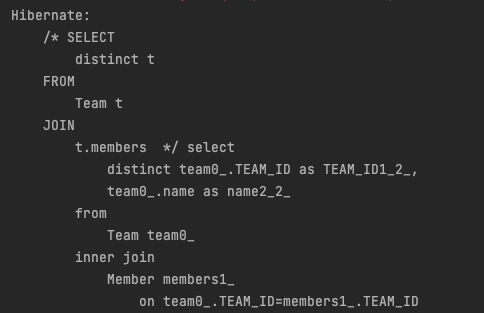 일반 JOIN과 달리, JOIN의 대상인 MEMBER 엔티티도 함께 SELECT 됨을 확인할 수 있다. JOIN FETCH는 Team 뿐만 아니라 연관된 Member까지도 함께 영속화한다.