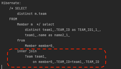INNER JOIN을 확인할 수 있다. 이처럼 JPA는 묵시적으로 JOIN문을 자동생성한다.