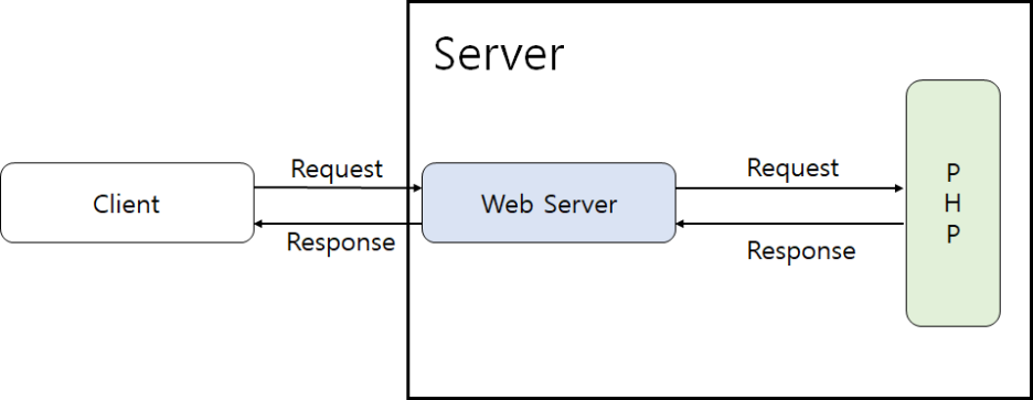 서버는 요청(Request)에 반응(Response)하는 일을 한다. 요청(Request)이 서버에 들어오면 그때 그때 필요한 PHP 코드만 번역해서 결과만 리턴하면된다. 그러므로 컴파일 언어보다는 인터프리터를 사용하는 스크립트 언어가 서버사이드 언어로 적합하다.