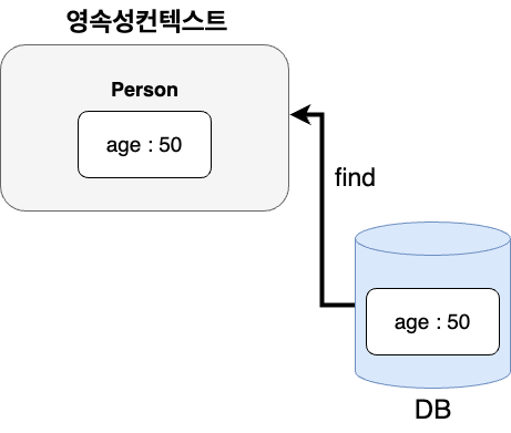 엔티티매니저의 find메소드로 영속성컨텍스트에 Person엔티티 하나를 DB에서 조회했다고 가정해보자. 영속성 컨텍스트에 조회된 Person의 나이는 50이다.