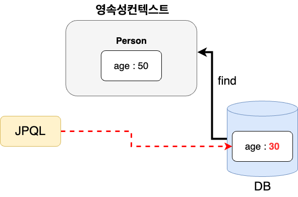 JPQL은 영속성컨텍스트를 거치지 않고 DB에 실행되므로 DB의 나이만 30으로 UPDATE된다. 영속성컨텍스트의 나이는 그대로 50이다. 여기서 데이터 정합성의 문제가 발생한다. 영속성컨텍스트를 초기화하지 않고 find메소드로 조회한다면 30이 아닌 50을 가져온다. 이처럼 벌크연산은 정합성을 깨뜨리는 문제를 발생시킬 수 있다.