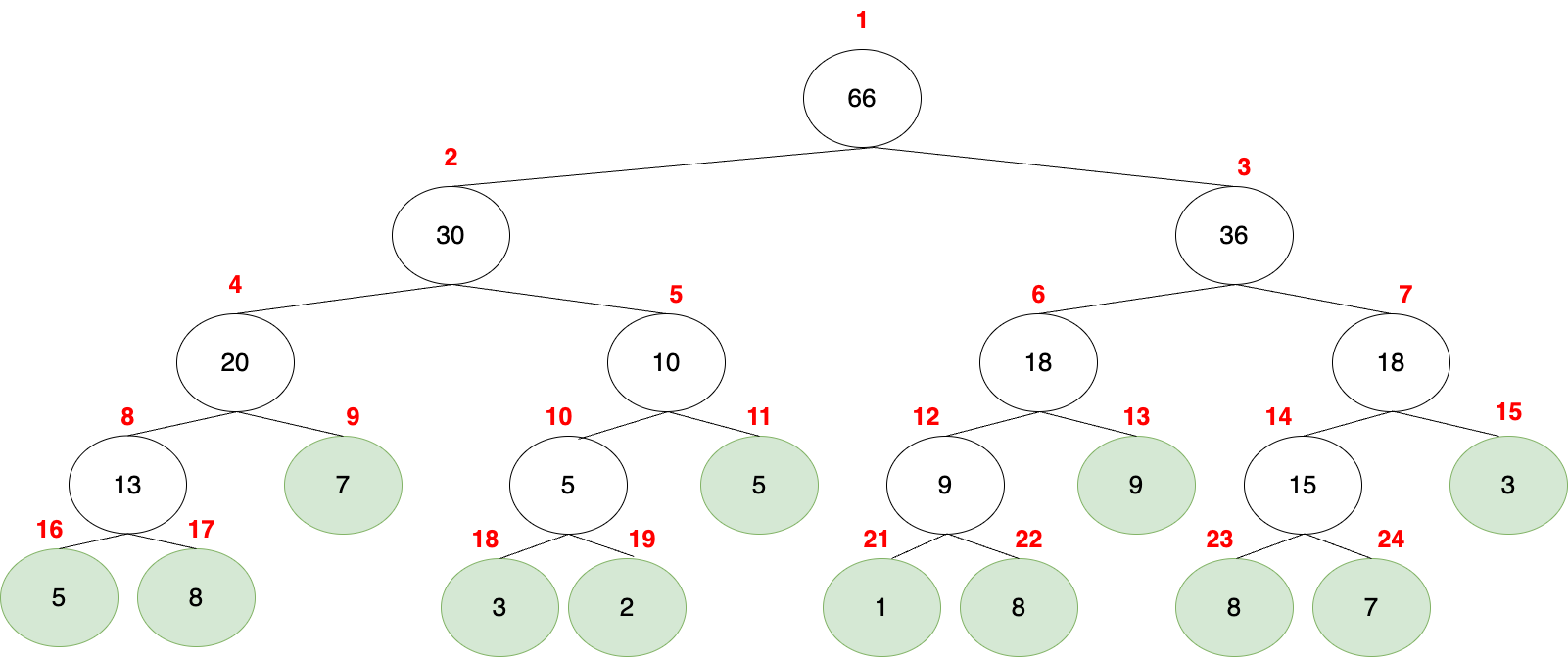 재귀호출 함수는 파라미터로 start,end,node를 갖는다. start-end는 구간을 의미한다. 그리고 node는 [start-end] 구간의 합이 저장된 트리의 위치를 의미한다. 이진트리는 좌측노드가 2*n, 우측노드가 2*n+1이다. 그래서 루트노드를 1로 지정해야 좌우노드에 인덱스지정이 간편해진다.