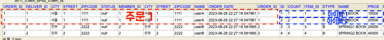 위 SELECT문을 H2 콘솔에 실행했더니 결과가 아래와 같았다.