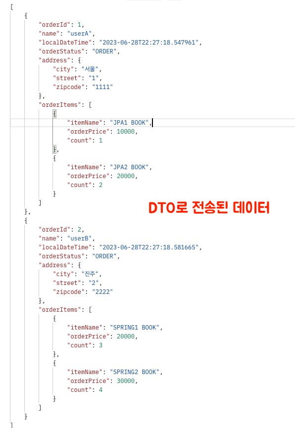 private List<OrderItemDto> orderItems; // DTO 안에 엔티티가 있으면 엔티티가 외부로 노출된다.OrderItem도 OrderItemDto를 만들어줘야 한다.