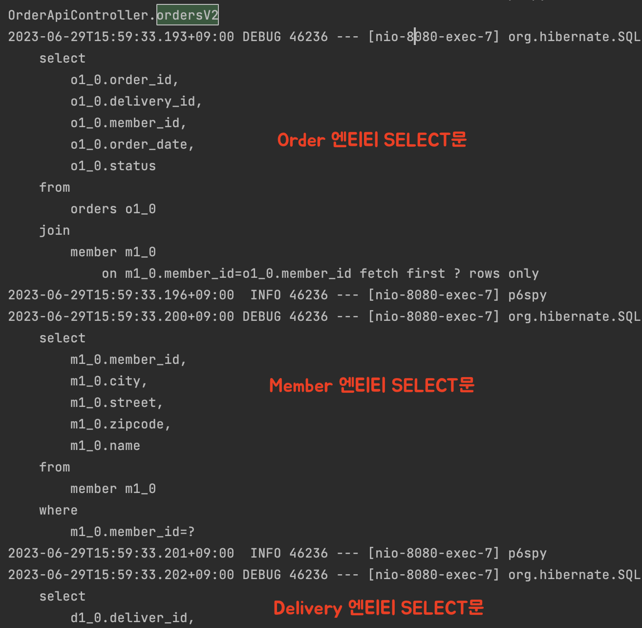 JOIN FETCH는 연관된 엔티티를 하나의 쿼리로 묶어 메모리에 로딩한다. 실제 실행되는 쿼리를 확인해보자.