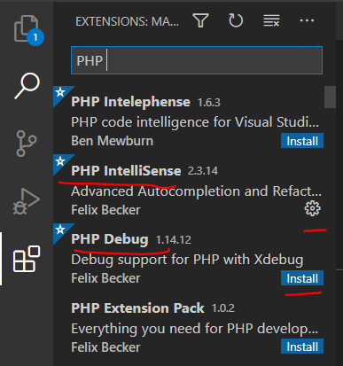 Extensions 탭에 가서 두 가지를 설치하면 된다. Install 버튼을 누르고 설치가 완료되면 톱니바퀴 모양이 된다. PHP Debug 프로그램은 설치 후 별도의 설정이 더 필요하다. ( PHP Debug 추가 설정은 과정이 복잡하고 저도 이걸 왜 해야하는지 이해를 잘 못했어요. 디버깅 과정을 위한 최적화 작업? 이라는데 정확히 이해를 못해서 아래에 링크를 겁니다. (13분 50초부터) )