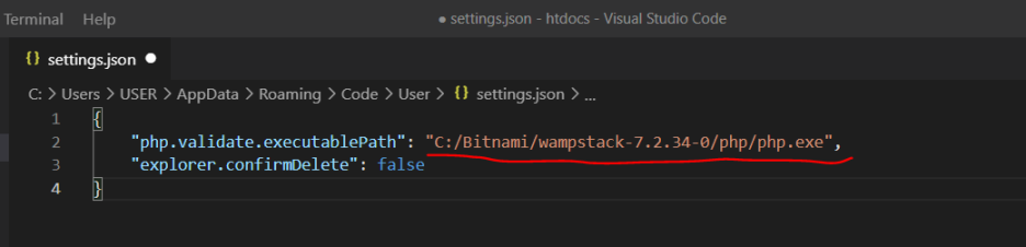 php.validate.executablePath 속성에 php.exe의 경로를 저장해준다. 환경변수를 지정할 때는 Path에 php.exe의 상위폴더인 php 디렉토리의 경로만 등록했다. 그 이유는 OS가 디렉토리를 탐색하기 때문이다. 그러나 이번에는 VS code가 직접 접근하는 것이기에(?) php.exe의 경로를 넣어준다.