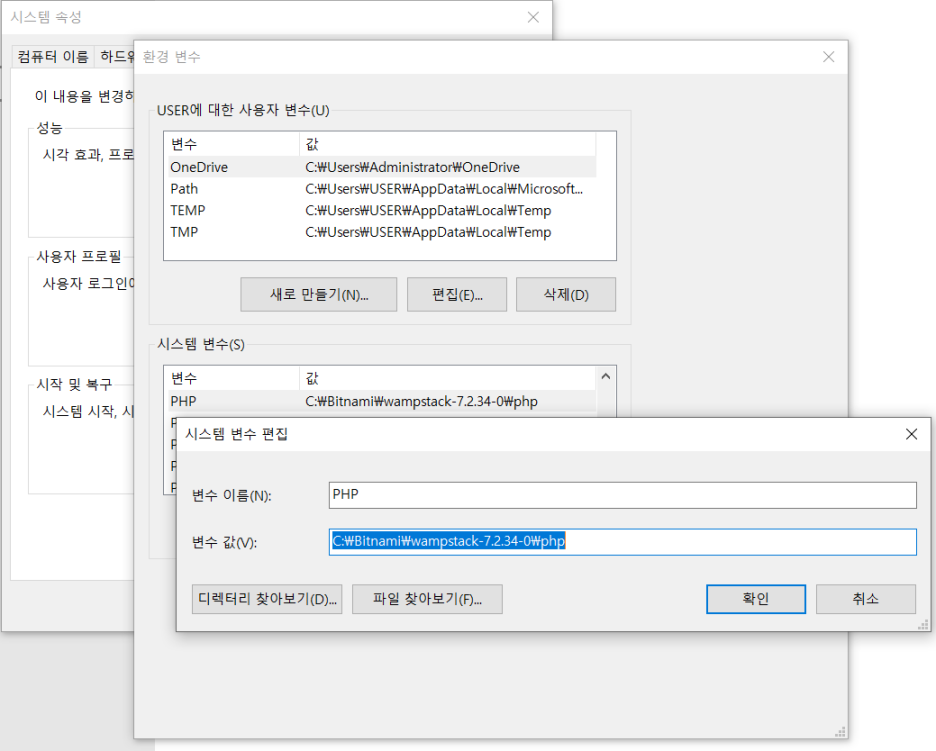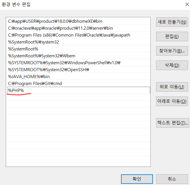 새로만들기 버튼을 눌러 시스템 변수를 만든다. 변수이름은 PHP 변수값은 php.exe가 위치한 디렉토리로 설정해준다.