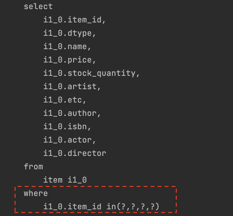 Order 엔티티가 참조하는 컬렉션의 원소 개수가 N개라면 N개의 SELECT문이 실행되어야 한다. 그러나 우리는 이미 fetch 관련 설정을 해놓았다. 100개까지는 IN절로 묶여 하나의 쿼리로 만들어 진다. 사이즈는 상황에 맞게 설정하면 된다. DB 중에 IN절 파라미터를 1000개로 제한하는 DB가 있으니 default_batch_fetch_size는 10개-1000개 사이로 설정하는 것이 좋다. size를 크게 잡을수록 쿼리가 적게 나갈 가능성이 높으니 성능에는 좋지만 DB에 부하가 적게 걸리는 적당선을 찾아야 한다.