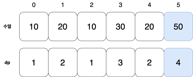 5가지 경우는 모두 50보다 작고 최댓값은 3이다. 그럼 5번째 50에서의 가장 긴 증가하는 부분수열은 3+1, 4가 된다. 이처럼 DP 풀이는 n이 만들어지는 n-1의 경우를 추려 점화식을 만들고 각 경우를 메모리제이션으로 저장하여 빠르게 문제를 푸는 방법이다.