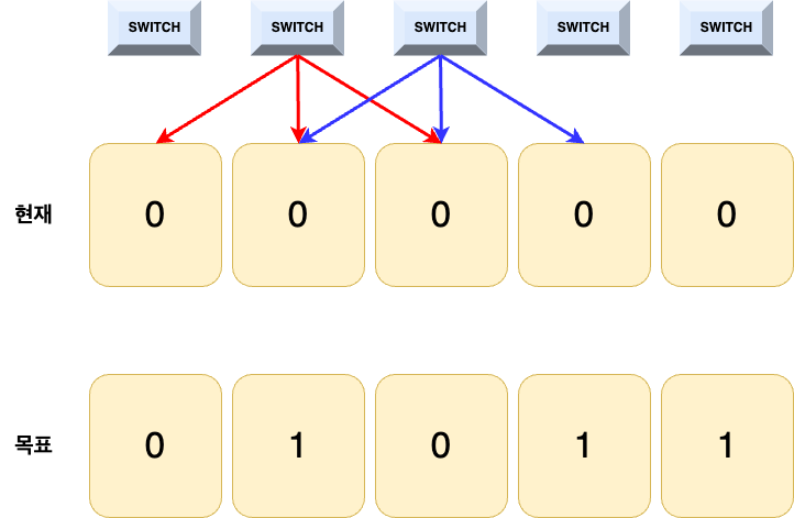 현재를 목표로 만드는데 한 개의 스위치가 여러 개의 전구에 영향을 주어, 경우를 복잡하게 만들기 때문이다. n번 스위치를 눌러 n번 전구를 목표와 일치시켰는데, n+1 스위치가 눌리면 다시 원위치이다.