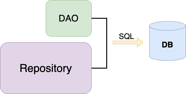 대부분의 데이터엑세스기술은 위 그림과 같이 이루어진다. 데이터엑세스로직이 담긴 Repository가 있고 데이터가 담긴 DAO(Data Acess Object)가 있다. Repository는 DAO에서 데이터를 받아 SQL을 완성하고 이를 DB와의 커넥션을 통해 실행한다.
