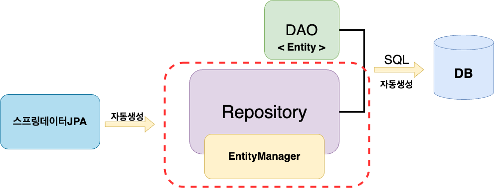 SpringDataJPA는 데이터엑세스 계층의 핵심로직인 Repository를 자동생성하여 제공하는 모듈이다. Repository는 CRUD를 구현하기 위한 모듈로, 여러 Repository는 로직이 서로 중복되는 경우가 많다. 그래서 SpringDataJPA는 공통된 기능을 모아 JpaRepository 인터페이스와 SimpleJpaRepository 구현체를 제공한다.