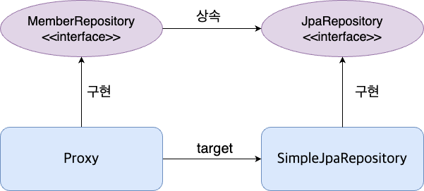 MemberRepository는 Member엔티티와 관련된 CRUD 기능을 구현해야 한다. JpaRepository에서 제공하지 않는 기능이다. Proxy 객체가 유용한 이유는 target으로한 객체의 기능과 더불어, 다른 기능도 추가로 사용할 수 있기 때문이다. MemberRepository에 정의된 기능도 Proxy객체는 사용할 수 있다. 그러나 SpringDataJPA에서 개발자는 인터페이스만 만들뿐, 구현체를 직접 만들지 않는다. 개발자는 그저 SpringDataJPA가 제공하는 Proxy객체를 사용할 뿐이다. Proxy객체는 MemberRepository에 정의된 기능이 호출되면 동적으로 기능에 맞는 구현로직을 생성하여 수행한다.