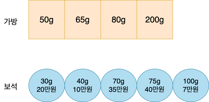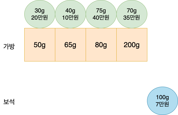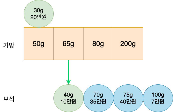 가격이 높은 보석은 30g가방이니 가방50g에는 30g보석을 넣는다.