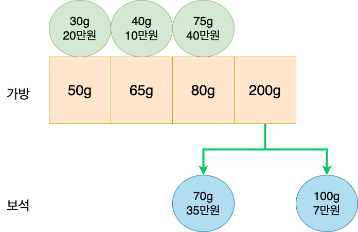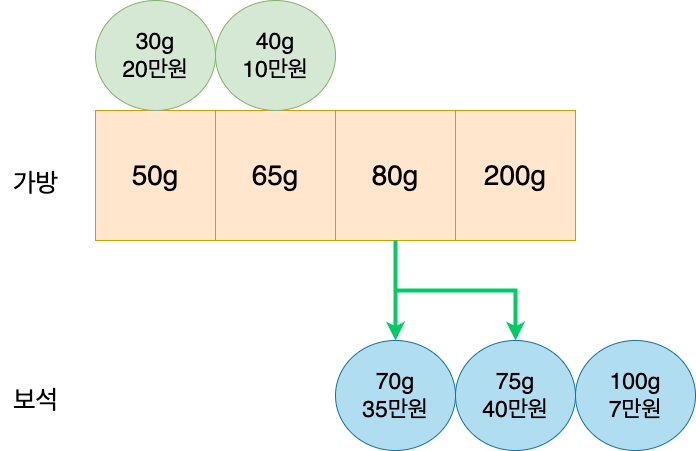 가방 80g에는 70g과 75g을 넣을 수 있다. 가격이 높은 75g을 넣어준다.
