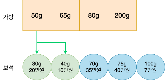 가방과 보석을 무게를 기준으로 오름차순으로 정렬한다. 가방 50g에는 30g과 40g이 들어갈 수 있다.
