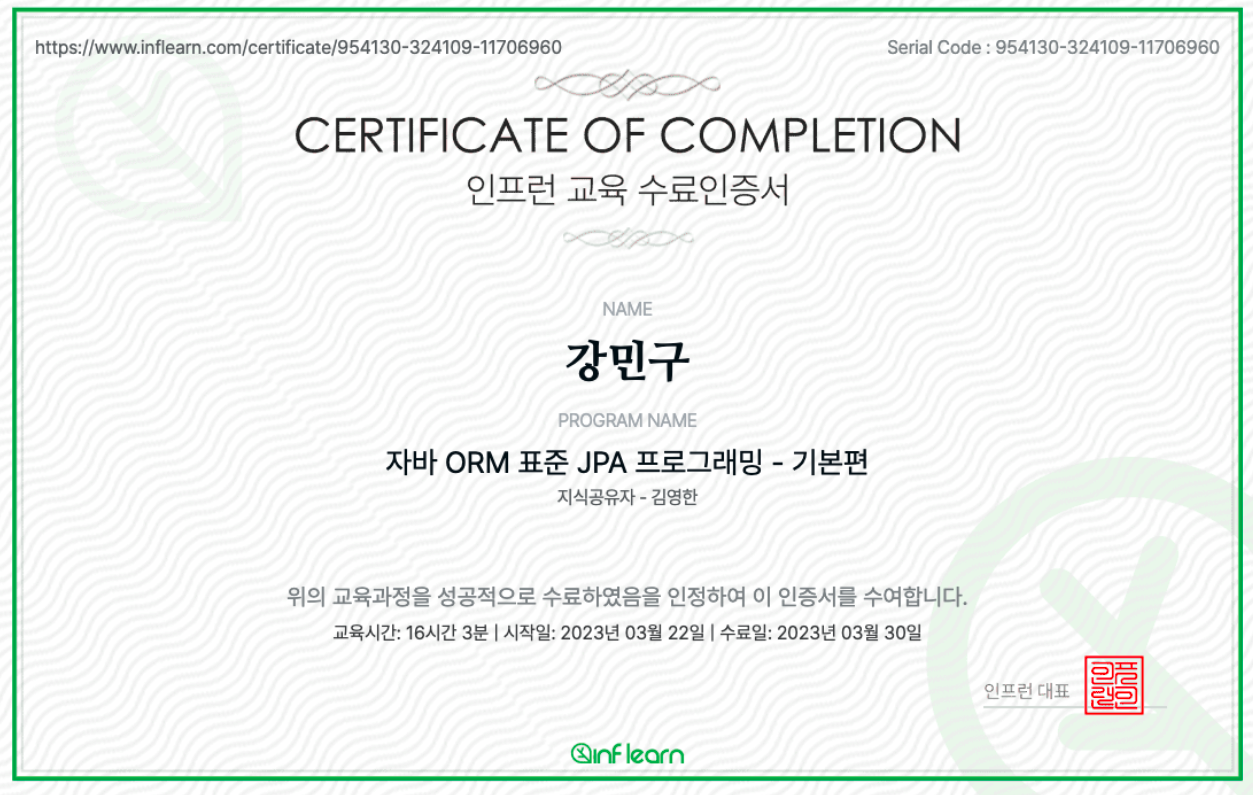 아는 형에게 추천받아 처음 들었던 김영한 강사님의 강의이다. 다른 사람 강의로 들어 수료증은 없지만 김영한 강사님 수업에 입문하게 해준 강의이다.