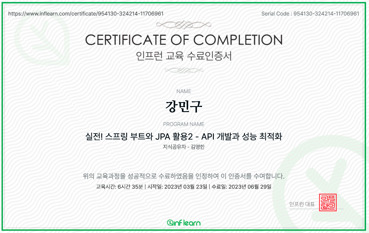 인프런 김영한 강사님의 SPRING 야생형 코스를 모두 수료하였다.