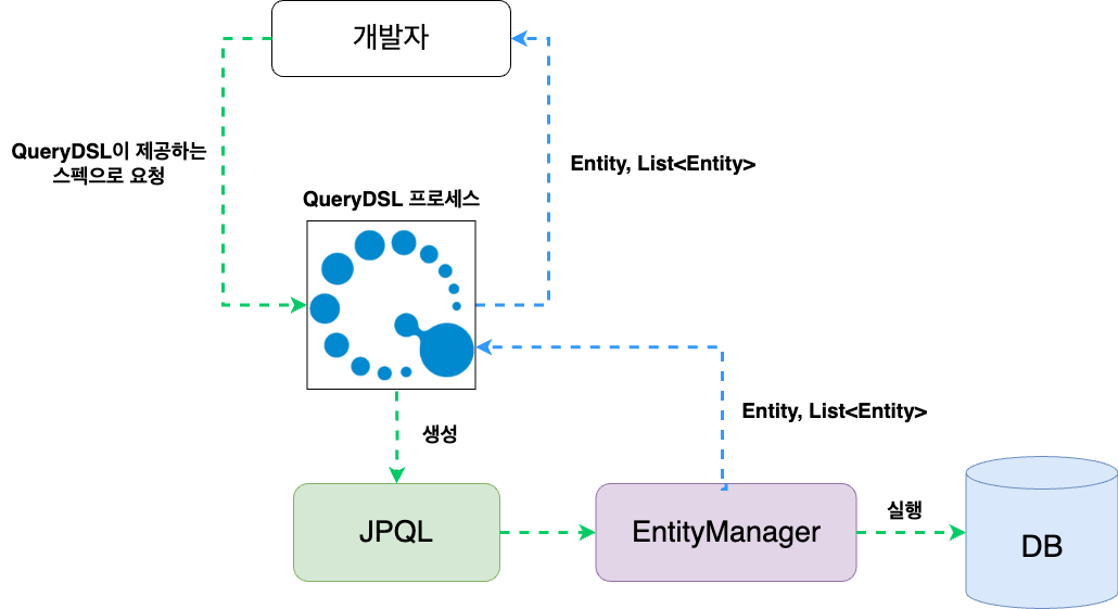 이외에도, JPA는 동적쿼리 작성을 위한 JPA 표준기술인 Criteria도 제공하지만 전혀 직관적이지 못하다. QueryDSL은 JPA가 지원하는 표준기술은 아니지만 타입안정성을 보장하고 직관적인 동적쿼리 작성이 가능하다. 이런 이유로 실무에서 JPA와 연계되어, 가장 많이 사용되는 프레임워크 중 하나이다.