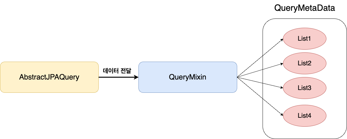 데이터 설정 작업을 QueryMixin으로 분리하면 Builder인 AbstractJPAQuery는 QueryMixin에게 데이터만 전달하면 된다. QueryMixin은 전달받은 데이터를 자료구조에 맞도록 정제하고 적합한 setter함수를 호출하여 실제 자료구조에 데이터를 저장하는 작업을 진행한다.