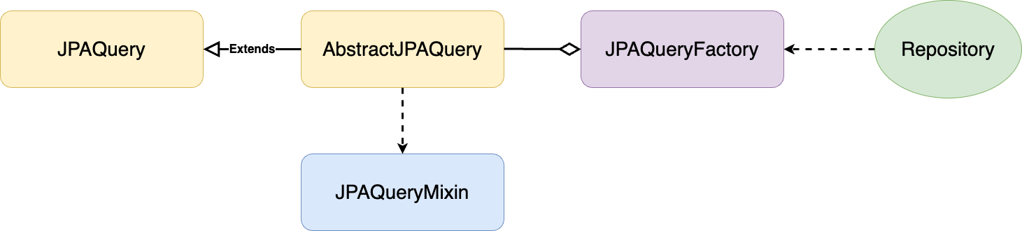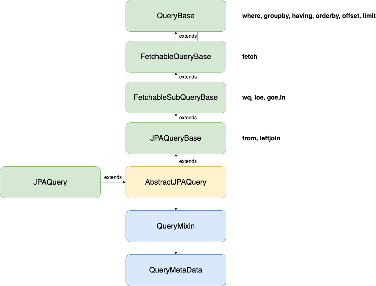 7. QueryMixin은 Builder가 데이터 설정을 단순하게 할 수 있도록, AbstractJPAQuery와 QueryMetaData 사이에서 중간 다리 역할을 한다.