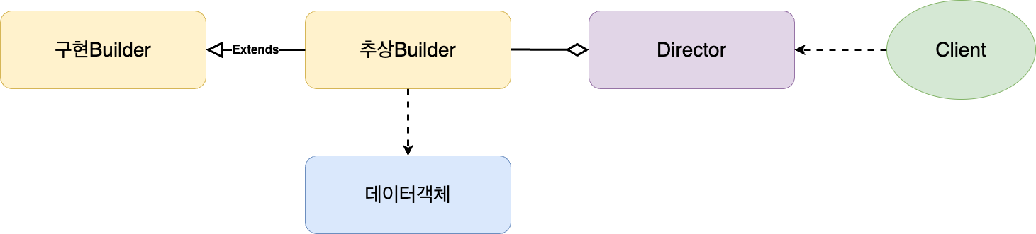 클라이언트가 특정 객체에 데이터 설정을 하려고 한다. 클라이언트가 직접 데이터객체에 접근하면 유연한 데이터 설정을 못하니 Builder 객체의 도움이 필요하다. 데이터 설정은 Builder객체의 역할이지만 클라이언트 친화적인 구조는 아니다. 클라이언트 친화적 설정이 가능하도록, Builder와 Client사이에 Director 객체를 둔다. 그리고 Director객체가 Builder 객체와 집합관계를 맺어 Director가 Builder 기능을 사용할 수 있도록 한다. 여기서 집합관계란 연관관계인데 서로 생명주기가 다른 연관관계를 의미한다.