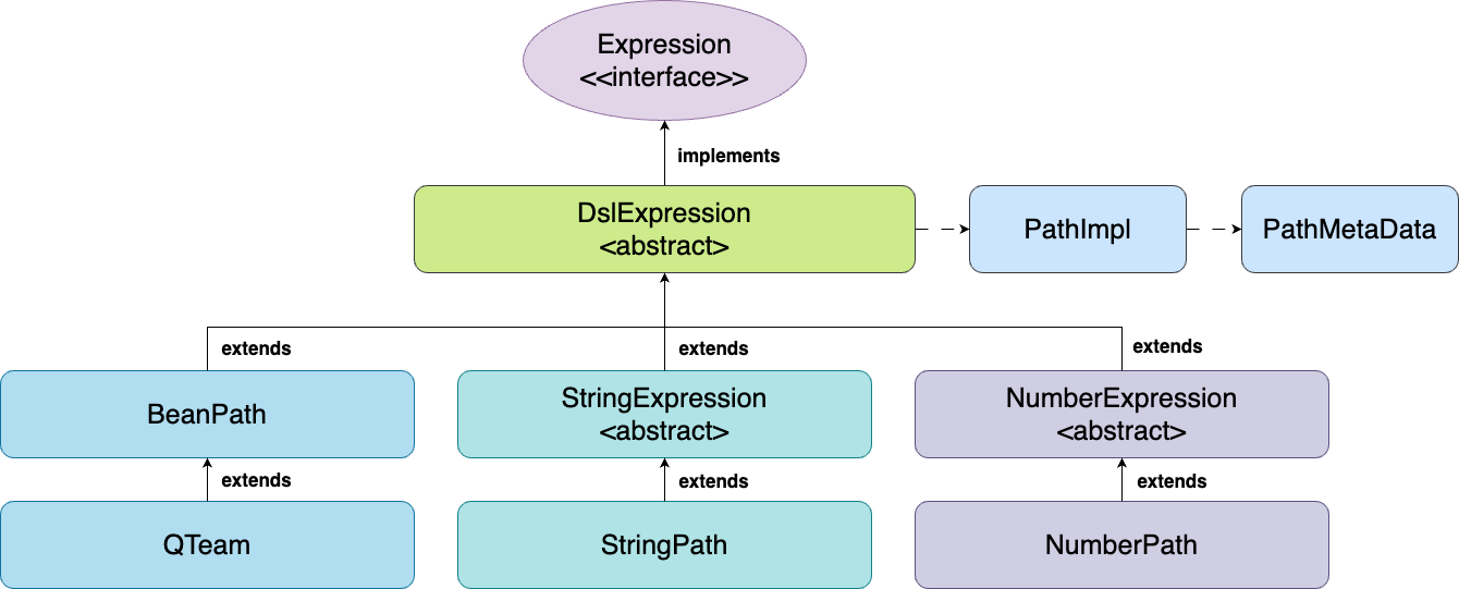 각 자료형은 DslExpression 클래스를 공통으로 상속하고 있다. DslExpression 클래스는 PathImpl 객체와 연관되어 있다. PathImpl 객체는 해당 자료형이 Q타입클래스인지 Property인지, Property라면 부모(Q타입클래스)는 누구인지, Q타입 클래스는 어떤 엔티티 혹은 객체를 토대로 만들어졌는지, Property는 Integer인지, String인지 boolean인지와 같은 핵심 메타데이터를 가지고 있다. 즉, Q타입클래스-속성 관계에 관한 메타데이터는 각 자료형이 모두 가지고 있는 PathImpl 객체에서 저장되어 관리된다. 이로써, 테이블-컬럼, 엔티티-필드 같은 Q타입클래스-속성 관계가 만들어져, member, member.team, member.age, member.age.goe 같은 직관적인 표현이 가능해진다.